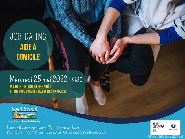 Le service d’aide à domicile du CCAS de Saint-Benoît organise un JOB DATING le 25 mai 2022 à la Mairie.